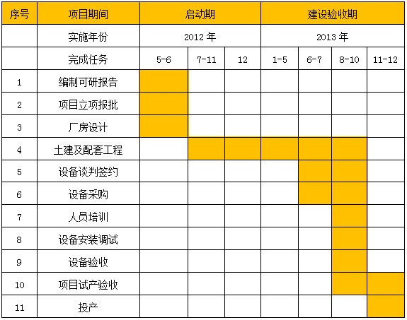 项目总投资主要来自项目发起公司自筹资金,按照计划在2012年3月份前完成项目申报审批工作。预计项目总投资资金到位时间在2011年4月底。整个项目建设期内,主要完成项目可研报告编制、项目备案、土建及配套工程、人员招聘及培训、设备签约、设备生产、设备运行及验收等工作。